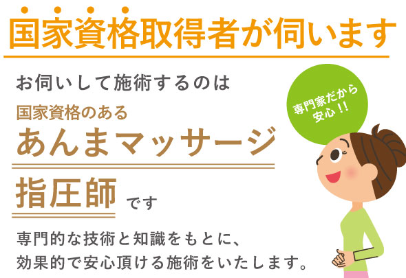 主に、在宅または施設にて療養中の患者様を対象とさせていただき、身体機能の回復維持を目的として、国家資格者がご利用者様おひとりおひとりの状況に合わせて訪問でのマッサージを行います。