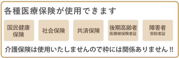 75歳以上の方は後期高齢者受給者証(1割負担)、75歳未満の方は国民健康保険(3割負担)や組合保険など、お手持ちの健康保険がお使いになれます。