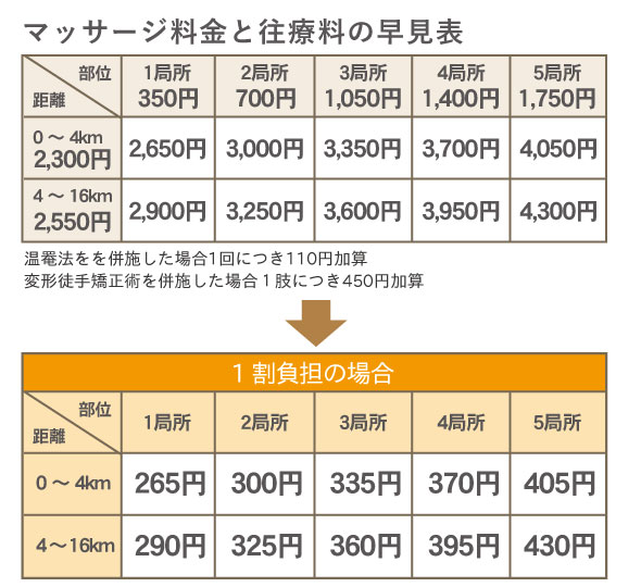 この場合、「訪問マッサージにこにこ」にお支払いいただく施術料金は、原則として一般的な病院等の医療機関と同様に自己負担額(1割〜3割)のみとなります。